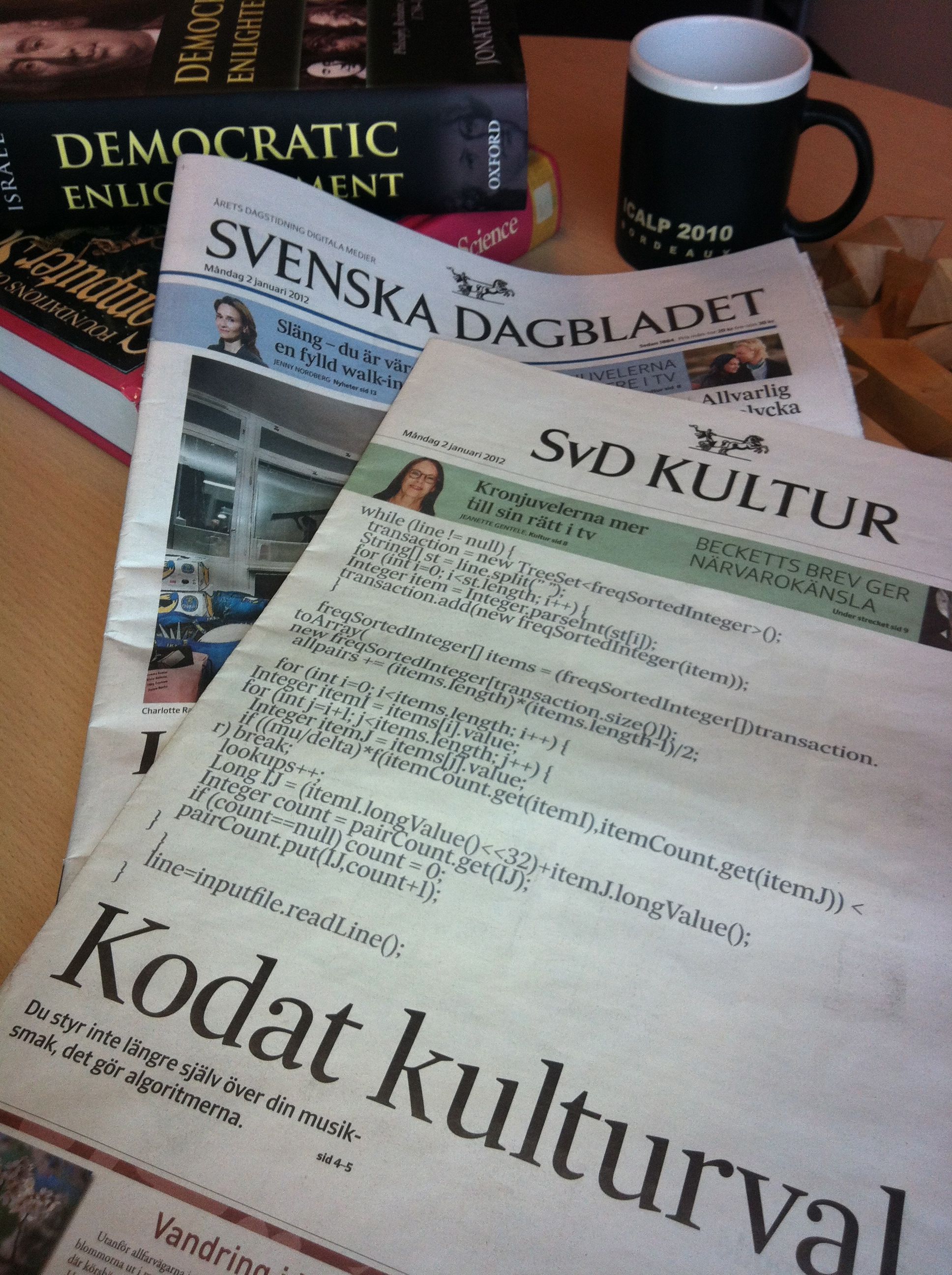 - The code on the section’s front page is from the very nice data mining research done at ITU: Andrea Campagna and Rasmus Pagh, Finding Associations and Computing Similarity via Biased Pair Sampling, The Ninth IEEE International Conference on Data Mining, Miami, Florida, USA, 6-9 December 2009 pp 61-70. Proper indentation or choice of a non-proportional font is not something the newspaper graphics guy cares about. (Hell, my own students don’t.) I proudly showed this to ITU’s vice chancellor Mads Tofte, but he “would have been more impressed if it had been in ML.”