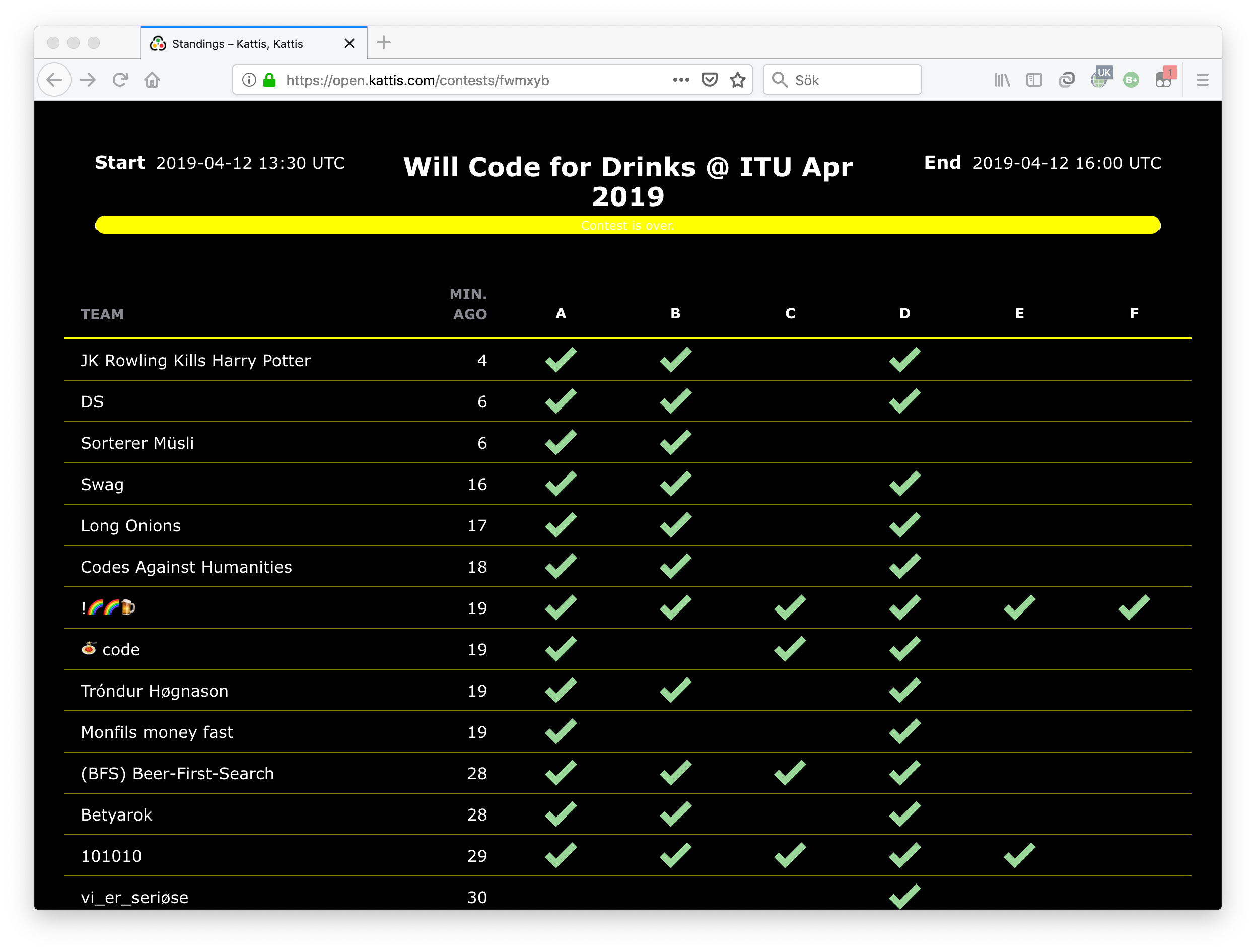 Here’s how the final standings of the event look using the standard Kattis scoreboard: