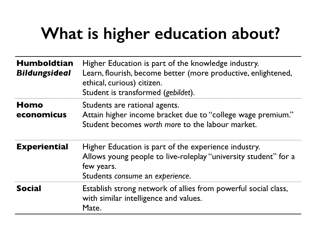 The two other perspectives on what Higher Education is about (Experiental, Social, both are Student perspectives) are much more difficult to align with the others. Students-as-consumers-of-an-experience (“University is Live Role Playing”) and students-as-social-primates (“University is a Meet Market”) have very different utility functions than both Faculty and Economists.