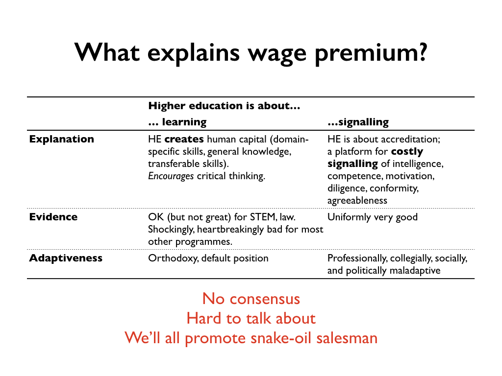 The narrative I tell myself is very much the first one, the capital-E Enlightenment story of knowledge transmission, critical thinking, and a marketplace of ideas. We can call this the Faculty view, or Researcher’s, or Teacher’s. The Economist’s view in the 2nd row is, thankfully, largely consistent with that; it’s no mystery that the labour market in knowledge economies pays a premium for knowledgeable graduates—the two incentives are somewhat aligned. (It does, however, make a big difference in how important transmission of knowledge and validity of assessment are in relation to each other. Again, “why not both?” and there is no conflict. Critical thinking versus conformity is a much more difficult tension to resolve.)