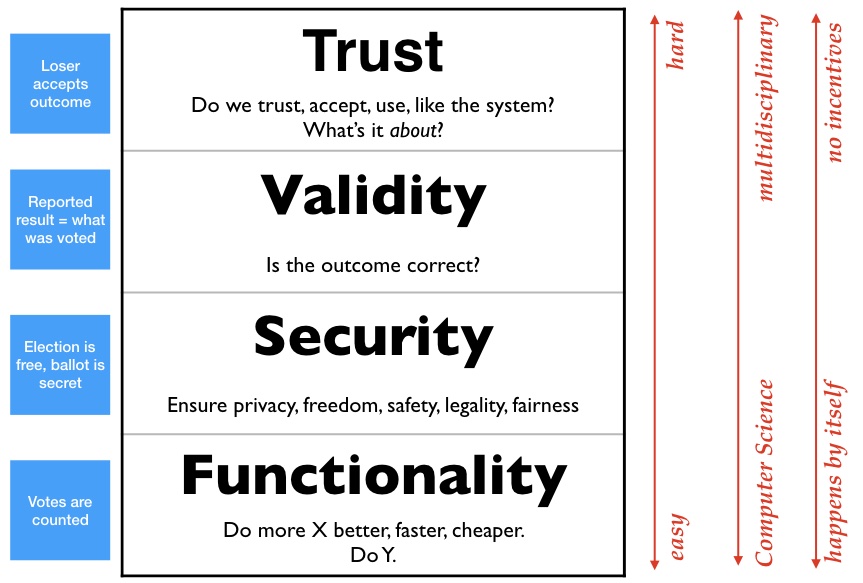 Let’s use voting as a concrete example to talk us through this. At the bottom is Functionality: voting is to increase a counter by 1 every time somebody casts a vote. This is easy to implement, and easy to digitise; any programmer can write an electronic voting system. Above that is Security: making sure the voting process is free (i.e., secret, private, non-coerced, universally accessible, etc.) This involves much harder computer science, for instance, cryptography. You need to have a pretty solid computer science background to get this right. Above that tier is Validity: how do we ensure that the numbers spat out by the election computer have anything to do with what people actually voted? This is even harder, in particular without allowing coercion by violating secrecy. (Google “vote selling” if you’ve never thought about this.) Finally, after thinking long and hard about all these issues (which by now include social choice theory, logic, several branches of mathematics) you arrive at what elections are actually about: Trust. The overarching goal of voting it so convince the loser that they lost. And this requires that the process is transparent.